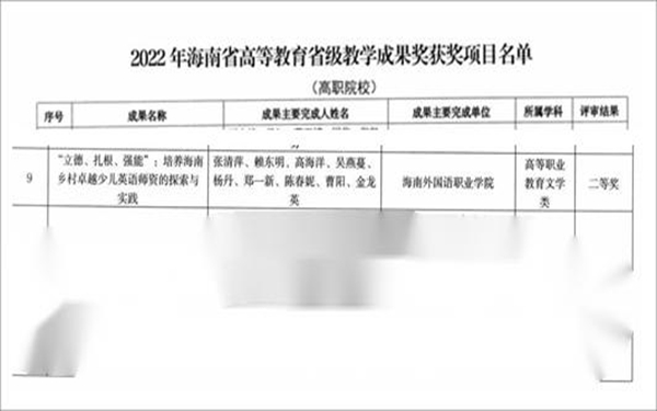 近日,海南省教育厅公布2022年高等教育省级教学成果奖评审结果,beat365英国官方网站英语系副主任张清萍团队的教学成果《“立德、扎根、强能”:培养海南乡村卓越少儿英语师资的探索与实践》喜获二等奖。
