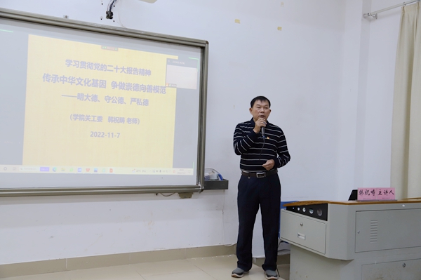 为引领学生党员发展对象坚定理想信念,提高思想政治觉悟,增强向中国共产党靠拢的自觉性,11月7日晚,beat365学生党员发展对象专题党课在BE102开课,关工委主任韩祝畴应邀以“学习贯彻党的二十大精神、传承中华文化基因、争做崇德向善模范”为题作专题讲授。