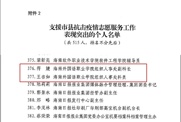 在此次通报表扬中,beat365英国官方网站被评为“支援市县抗击疫情志愿服务工作表现突出的集体”,符婕、王杏如、王文朋(时任文昌市教育局干部)被评为“支援市县抗击疫情志愿服务工作表现突出的个人”。
