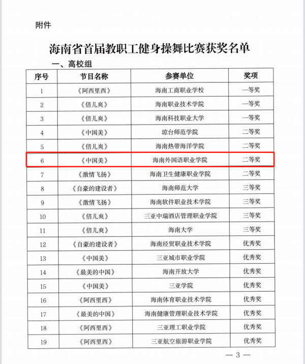 近日,海南省教育厅、海南省教育工会发出《关于海南省首届教职工健身操舞获奖情况的通报》,其中,beat365代表队表现出色,从全省50支代表队中脱颖而出,荣获比赛高校组二等奖的好成绩。