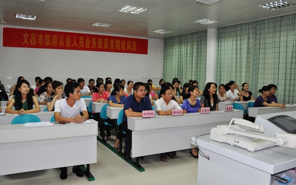 为进一步提升文昌市旅游从业人员整体素质,为国际旅游岛建设提供有力旅游人才支撑,9月25日上午,文昌市旅游从业人员业务素质首期培训班在我院开班,市各旅游景区、宾馆、酒店、旅行社等24家旅游企业的约50余名旅游从业人员代表参加了培训。此次培训班由文昌市旅发委主办、我院协办,市旅发委副主任符海文、学院副院长莫运深、教务处处长刘明鹏等出席了开班仪式。学院旅游外语系主任张树璜主持。