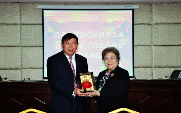台湾德霖技术学院董事长林谢罕见、校长洪久贤在随后的发言中也介绍了该学院的基本情况,并表达了资源共享、优势互补的合作意愿。在友好、热烈的气氛中,与会者就教育模式、办学理念、学生培养等话题展开探讨。最后,双方就教师互访和学生交流等合作达成了意向,并签署了合作意向书。签约仪式后,还进行了简短的互赠礼物仪式。