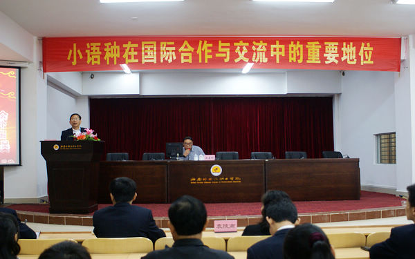 12月16日下午,我院图书馆多功能报告厅内人头涌动、气氛热闹。当一句句铿锵有力、字字珠玑的话语从坐在主席台上的国家外国专家局资深顾问吴星彬博士口中“蹦出”时,台下都报以了热烈的掌声。作为一位长期从事外事、侨务工作的语言专家,吴星彬博士此次在百忙之中到访我院讲学,结合个人丰富的阅历做“小语种在国际合作和交流中的重要地位”讲座,与我院广大师生分享了他在小语种学习应用及外事工作上的经验、领悟和见地,用其扎实的专业素养和深厚的知识底蕴描绘了一幅关于小语种的大世界,让每一位观众都感到受益匪浅。