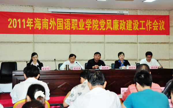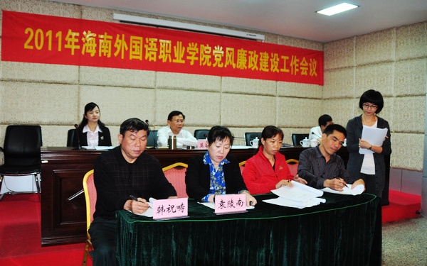3月22日下午,我院在会议厅隆重召开2011年党风廉政建设工作会议,学院党委书记韩祝畴、院长袁陵南、党委副书记兼纪委书记莫运深、副院长陈礼民、副院长李渝凤及全体中层管理干部、各部门处室管理人员等参加了会议。韩祝畴书记主持会议。