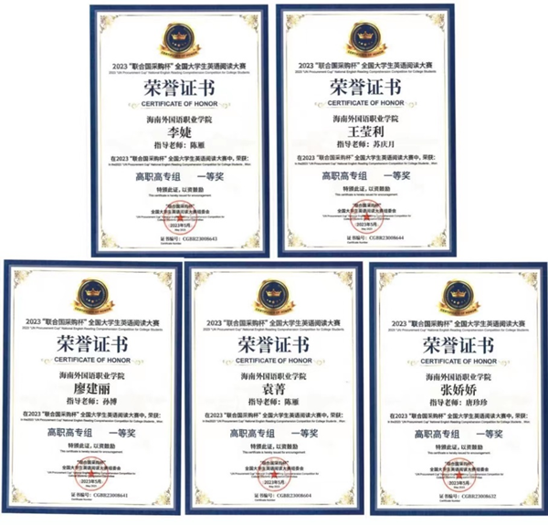近日,由中国商务部主管的国家一级学会——中国联合国采购促进会主办、联贸云和赛氪网承办的2023“联合国采购杯”全国大学生英语阅读大赛落幕。beat365积极组织学生参加比赛,经过激烈角逐,英语学院、国际商务学院和西方语言学院的22名学生表现突出,从全国众多高校的选手中脱颖而出,喜获佳绩。其中,李婕等5位同学荣获高职高专组一等奖,林茜雯等7位同学荣获高职高专组二等奖,陈宁和张依诺荣获高职高专组三等奖,姚如桦等7位同学荣获高职高专组优秀奖。英语学院陈雁、苏庆月、李杏妹和孙博老师以及国际商务学院唐艳、钟阳惠、巫满霞和唐珍珍老师荣获“优秀指导老师奖”。