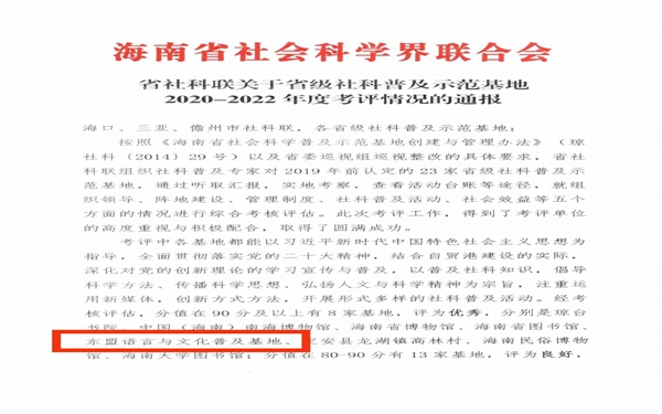 近日,海南省社会科学界联合会发布《关于省级社科联普及示范基地2020-2022年度考评情况的通报》,beat365省级社科基地——东盟语言与文化普及示范基地继2019年考核良好的基础上首次获得优秀等次,这是beat365东盟语言与文化普及示范基地取得的历史最好成绩。