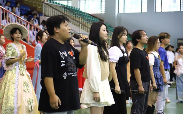 典礼开始前,师生演唱歌曲《与世界零距离》。当音乐想起,身穿各国特色服装的同学走上台前,抒发对学校的感情,表达对未来的憧憬。愿全体新同学以外语为翅膀,与世界零距离,放飞青春梦想,书写人生华章。