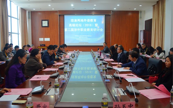 11月27日,由海南省大学外语教学指导委员会、重庆市外文学会、海南省英语日语应用研究会主办,我院承办的琼渝两地外语教育高端论坛(2016)暨第二届涉外职业教育研讨会在我院综合楼七楼第一会议室举行,来自海南、重庆两地各高校的专家、学者齐聚一堂,共同探讨小语种专业设置和涉外职业人才培养。海南省英语日语应用研究会副会长、我院副院长杨学前副教授主持开幕式。