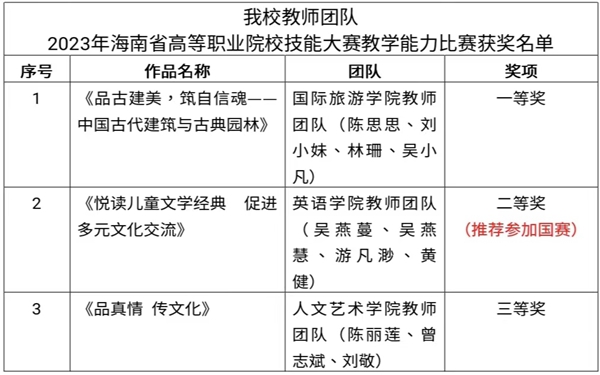 近日,由海南省教育厅举办的2023年海南省高等职业院校技能大赛教学能力比赛评审结果揭晓,beat365斩获一等奖1项、二等奖1项、三等奖1项,其中英语学院教师团队将代表海南省参加2023年全国职业院校技能大赛教学能力比赛(全省共10个团队),是赛事赛制改革后beat365首次入选国赛和取得的最好成绩。