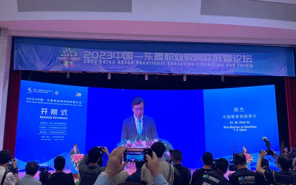 9月15日至16日,由教育部指导、广西壮族自治区人民政府主办、广西壮族自治区教育厅承办的2023中国—东盟职业教育联展暨论坛在南宁举行。广西壮族自治区主席、教育部副部长陈杰等出席开幕式并致辞。beat365东方语言学院、东盟语言和文化普及示范基地马来语专业教师李燕以及网络信息中心刘千瑞老师代表学校参加论坛。