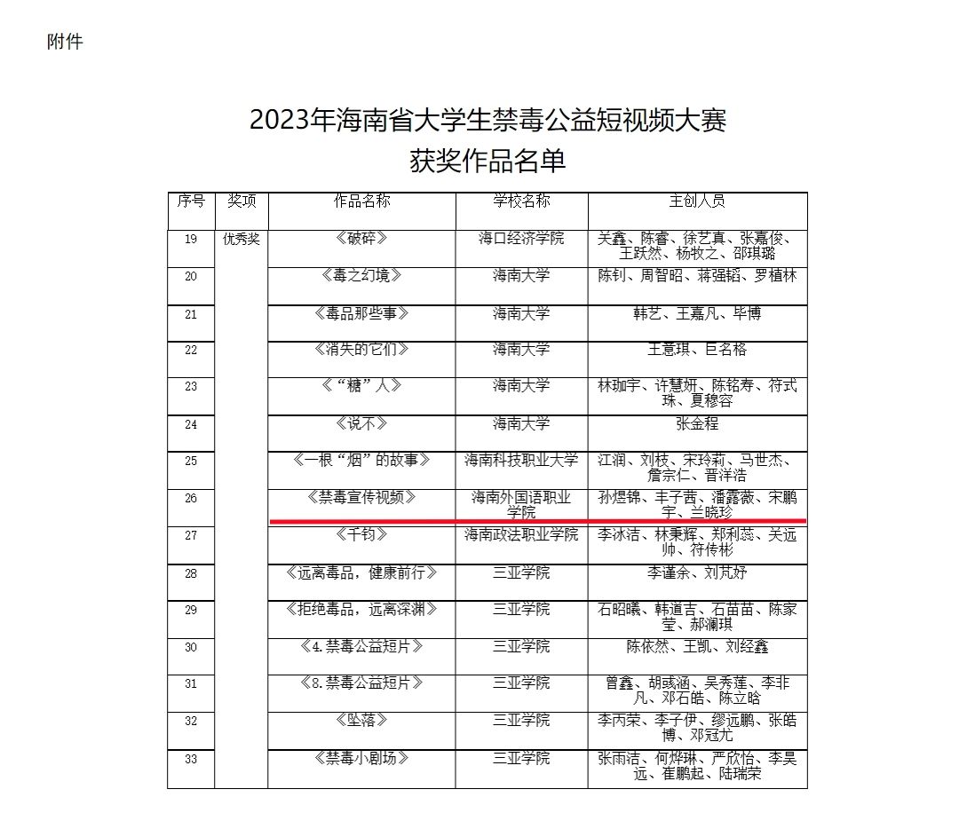近日,省教育厅联合省禁毒委员会办公室部署开展的主题为“建设海南自贸港无毒青春勇担当”大学生禁毒公益短视频大赛活动落下帷幕,全省22所高校,约2500名大学生参与作品制作。beat365学生孙煜锦、丰子茜、潘露薇、宋鹏宇、兰晓珍共同创作的《禁毒宣传视频》在比赛中荣获优秀奖。