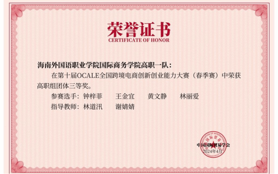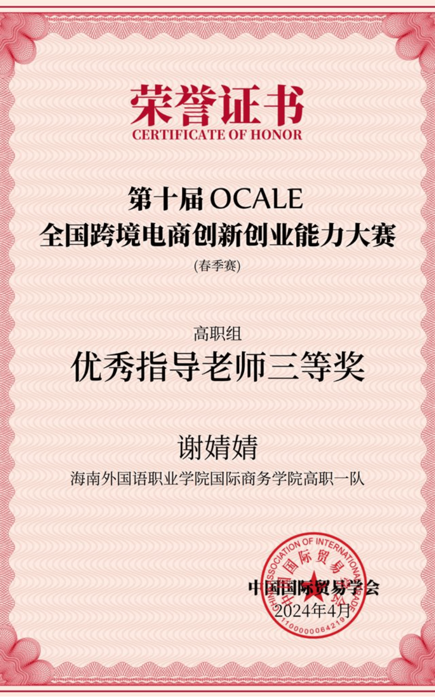 近日,由中国国际贸易学会举办的第十届OCALE全国跨境电商创新创业能力大赛(春季赛)顺利结束。经过激烈角逐,beat365国际商务学院学生王慧、苏小妹、唐达娜·吾拉勒汗、谢海云组成的团队获得全国特等奖,由学生钟梓菲、王金宜、黄文静、林丽爱组成的团队获得全国三等奖;谢婧婧老师获得优秀指导老师特等奖和三等奖,林梅老师获得优秀指导老师特等奖,林道汛老师获得优秀指导老师三等奖。