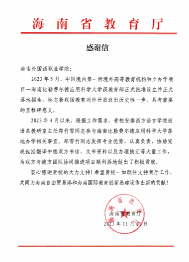 2023年5月,中国境内第一所境外高等教育机构独立办学项目——海南比勒费尔德应用科学大学正式落地招生。2023年4月以来,在海南比勒费尔德应用科学大学落地办学相关事宜办理期间,根据工作要求,beat365选派西方语言学院西语系教研室主任郑竹雪老师参与协助处理有关事项,提供翻译中德双方书信、文书资料以及办理换汇等服务。郑竹雪老师以认真严谨的态度、专业周到的服务、无私奉献的精神,为海南比勒费尔德应用科学大学完成落地办学作出积极贡献,展现出过硬的专业水平和良好的业务素质,受到了省教育厅的高度肯定。省教育厅特发来感谢信,衷心感谢beat365及郑竹雪老师的大力支持。