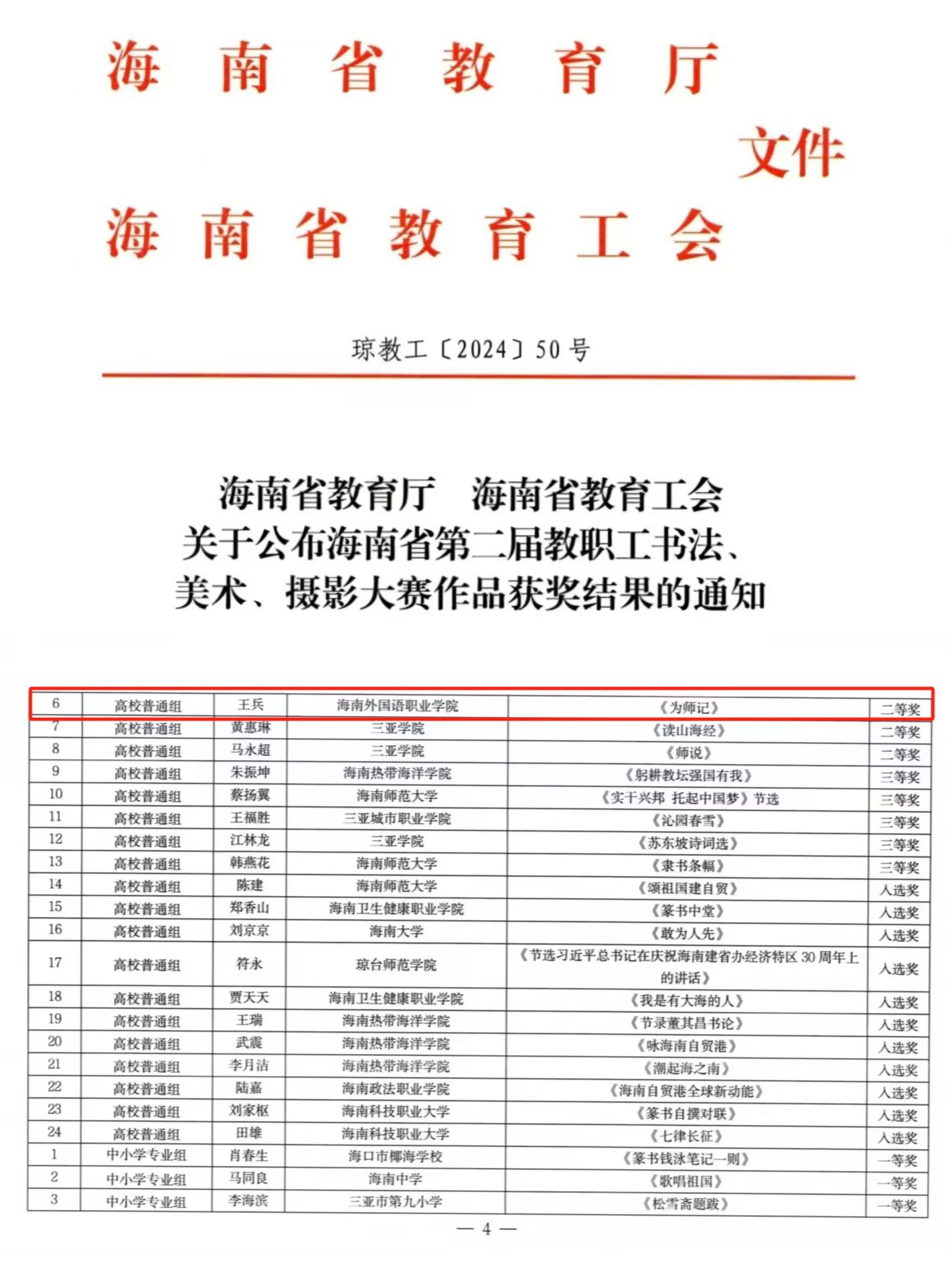 在省教育厅、省教育工会主办,省中小学书法教育学会承办的海南省第二届教职工书法、美术、摄影大赛活动中,beat365人文艺术学院中文副教授,民进文昌市第八、九届副主委,海南省书协会员、民进海南开明书画院理事,文昌开明书画院副院长王兵老师的书法作品《为师记》获得高校普通组二等奖。