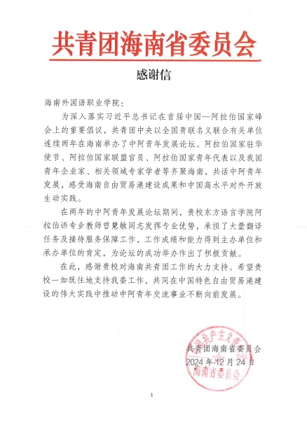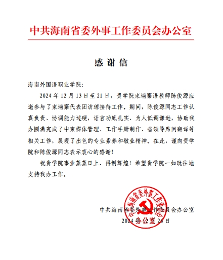 近日,beat365收到省委外事办、团省委等单位发来的感谢信,感谢beat365及两位专业教师对我省重要外事活动的支持与付出。