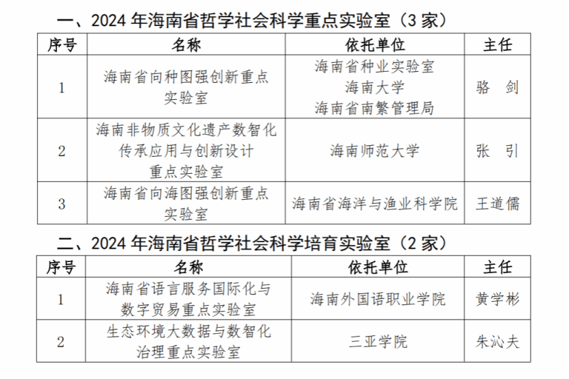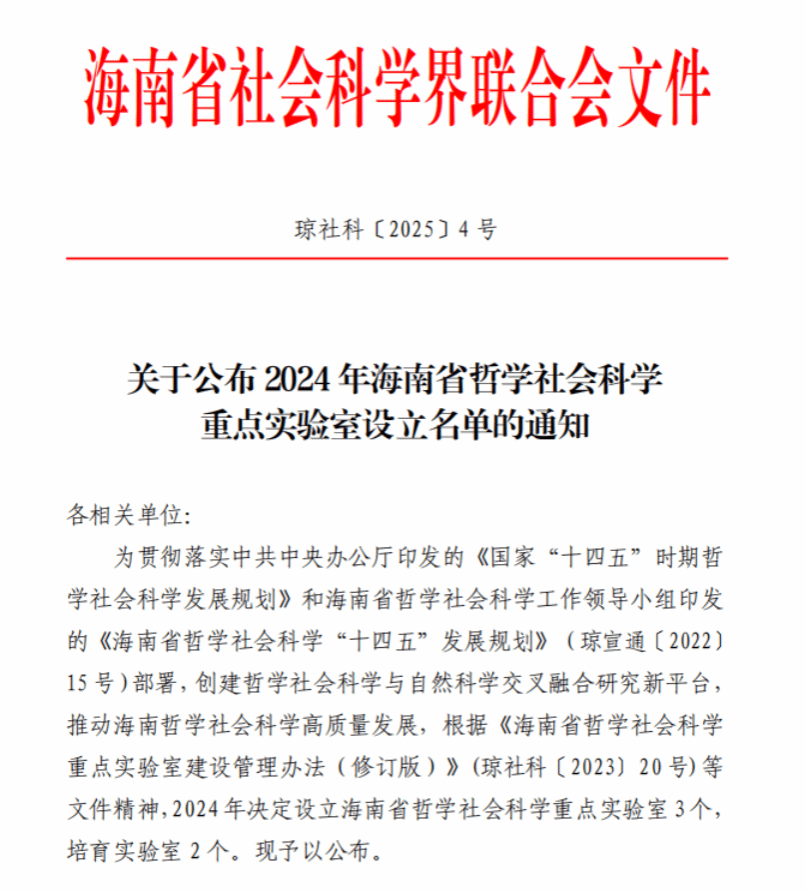 据悉,创建哲学社会科学重点实验室,是海南省贯彻落实党中央提出的加快构建中国特色哲学社会科学战略任务和中共中央办公厅印发的《国家“十四五”时期哲学社会科学发展规划》的部署,在加快中国特色哲学社会科学“三大体系”建设,促进重点学科优势突出、新兴学科和交叉学科创新发展,创新学术理论体系、学术研究组织体系、学术平台支撑体系上,推出的学术研究创新平台。自2022年海南省社科联启动哲学社会科学重点实验室创建工作以来,共批准建设12家重点实验室和2家培育实验室,初步形成“五向图强”(“向种图强”“向海图强”“向天图强”“向数图强”“向绿图强”)哲学社会科学重点实验室交叉学科创新发展学术研究平台支撑体系。