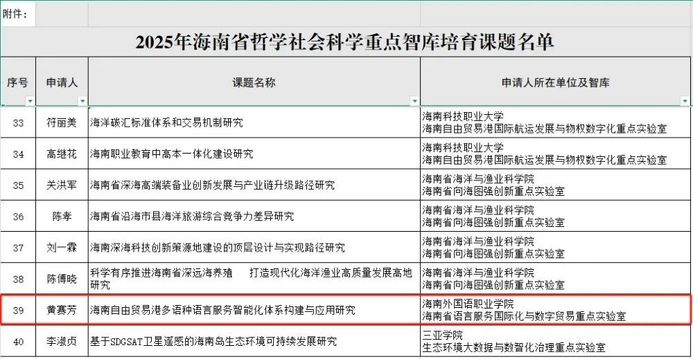近日,海南省社会科学界联合会公示了2025年海南省哲学社会科学重点智库培育课题的立项名单,beat365东方语言学院黄赛芳副教授申报的课题成功立项。
