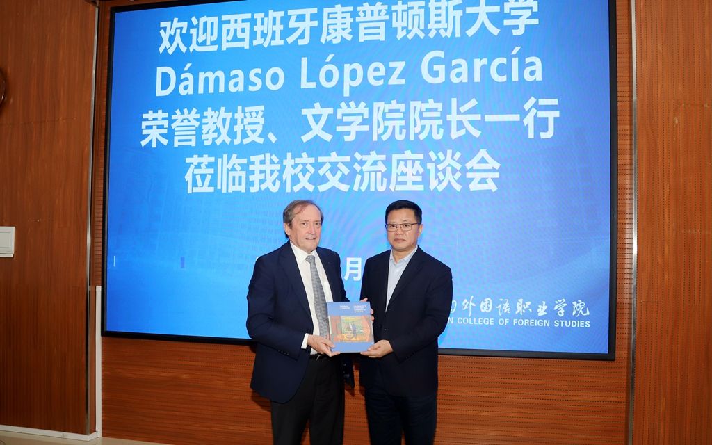 黄学彬对康普顿斯大学Dámaso López García院长一行表示欢迎,并相互交换礼物。