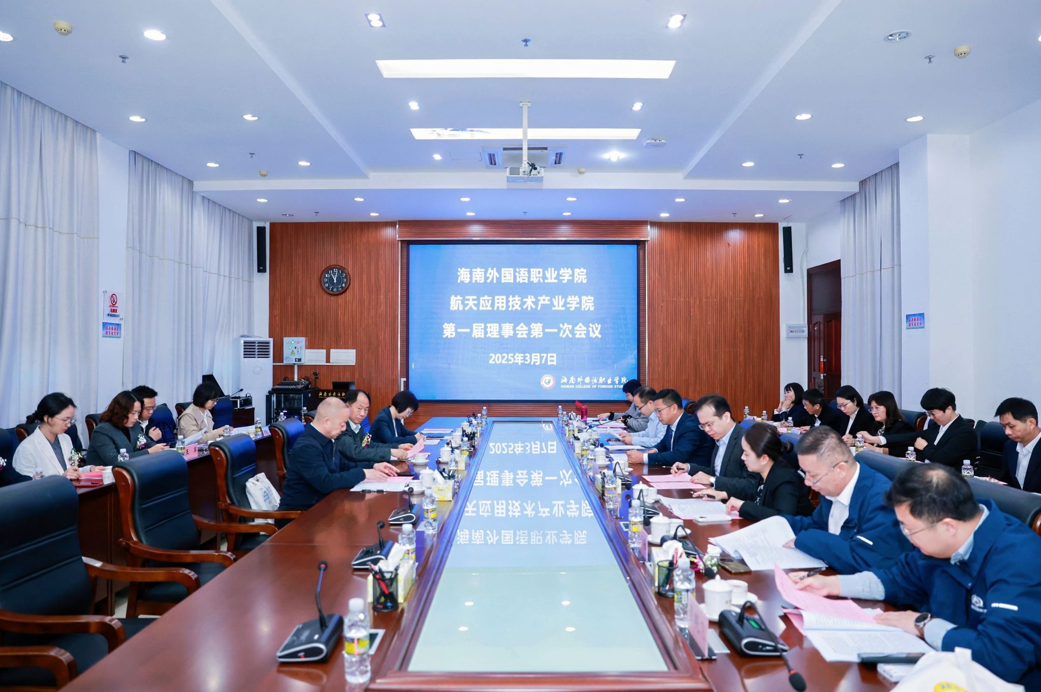 成立大会结束后,召开了航天应用技术产业学院暨航天应用人才培养共同体第一届理事会第一次会议。会议审议产业学院理事会章程和2025 年工作要点,并围绕产业学院建设具体事项进行交流探讨。2025年,航天应用技术产业学院暨航天应用人才培养共同体将重点聚焦建立协作机制、搭建资源共享平台、定期召开会议、构建课程体系、打造“双师型”教学团队、打造核心产品等六大方面开展建设,不仅推动航天文化与旅游产业深度交融,促进专业集群与文昌航天城产业链无缝对接,同时推进航天产品与服务商业化推广进程,打造航天语言服务标准化体系,为文昌国际航天城建设国际航天合作枢纽提供坚实的语言服务支撑。