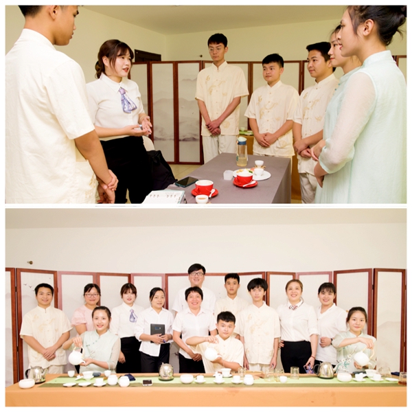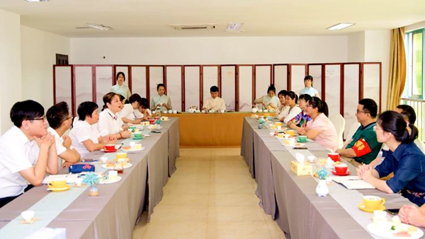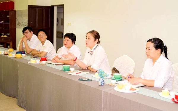 两校领导及教师在茶艺实训室举行调研交流会,文昌市中等职业技术学校校长林勇、副校长林方立、酒店管理和餐饮管理负责人刘庆媚老师以及导游服务、酒店管理、餐饮管理等相关专任教师们参加此次交流会。