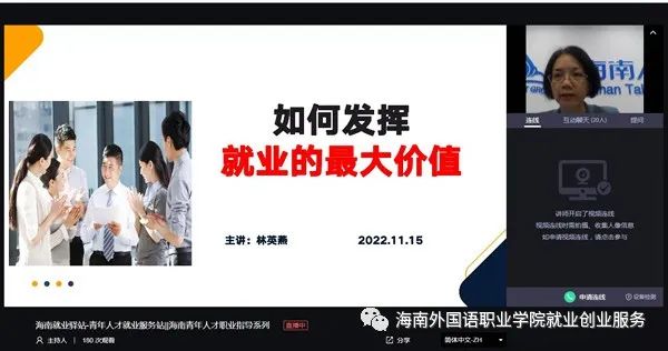为提高2023届毕业生的就业应聘知识和技能技巧,促进毕业生更好地实现就业,11月15日,由海南省人力资源开发局和beat365主办,海南就业驿站——青年人才就业服务站承办的海南青年人才职业指导系列讲座以线上的形式在全校范围内举办。海南省第一批职业指导师、海南省职业指导行业协会秘书长、高级职业咨询督导师林英燕导师和一级(高级)企业人力资源管理师宋薇薇为beat365毕业生进行专题讲解。招生就业处副处长赖东明主持讲座。全体2023届毕业生约2400多人参加讲座。