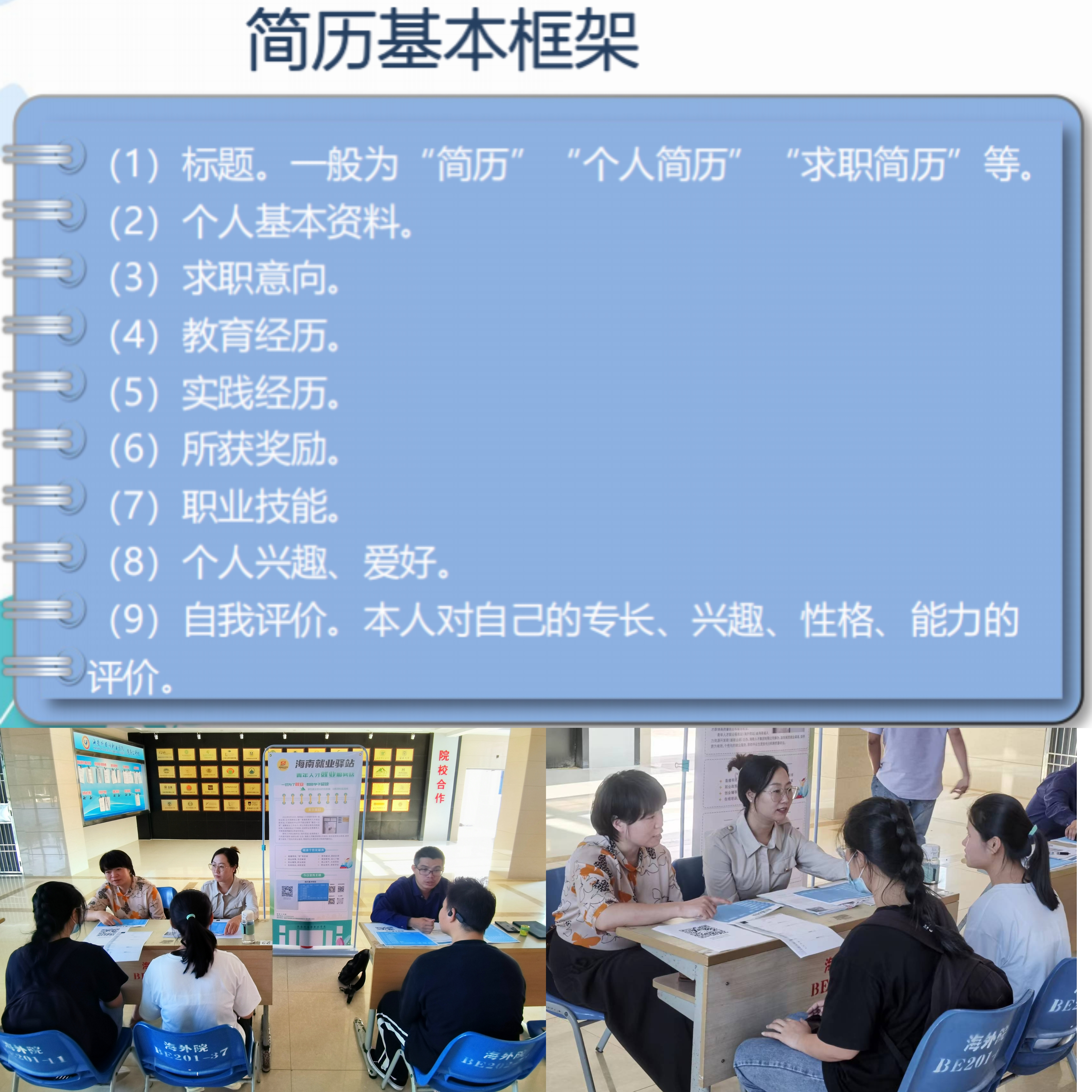 活动现场,就业指导教师为同学们讲述简历制作的基本框架。重点引导在校学生多多进行实践活动、考取证书,为制作简历提供素材。