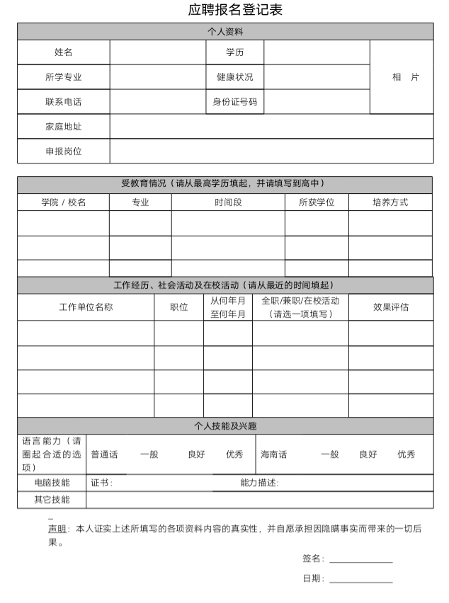 5.报名时请携带身份证、毕业证的原件及复印件、其他相关证书复印件各一份,同时上交“应聘报名表”。
