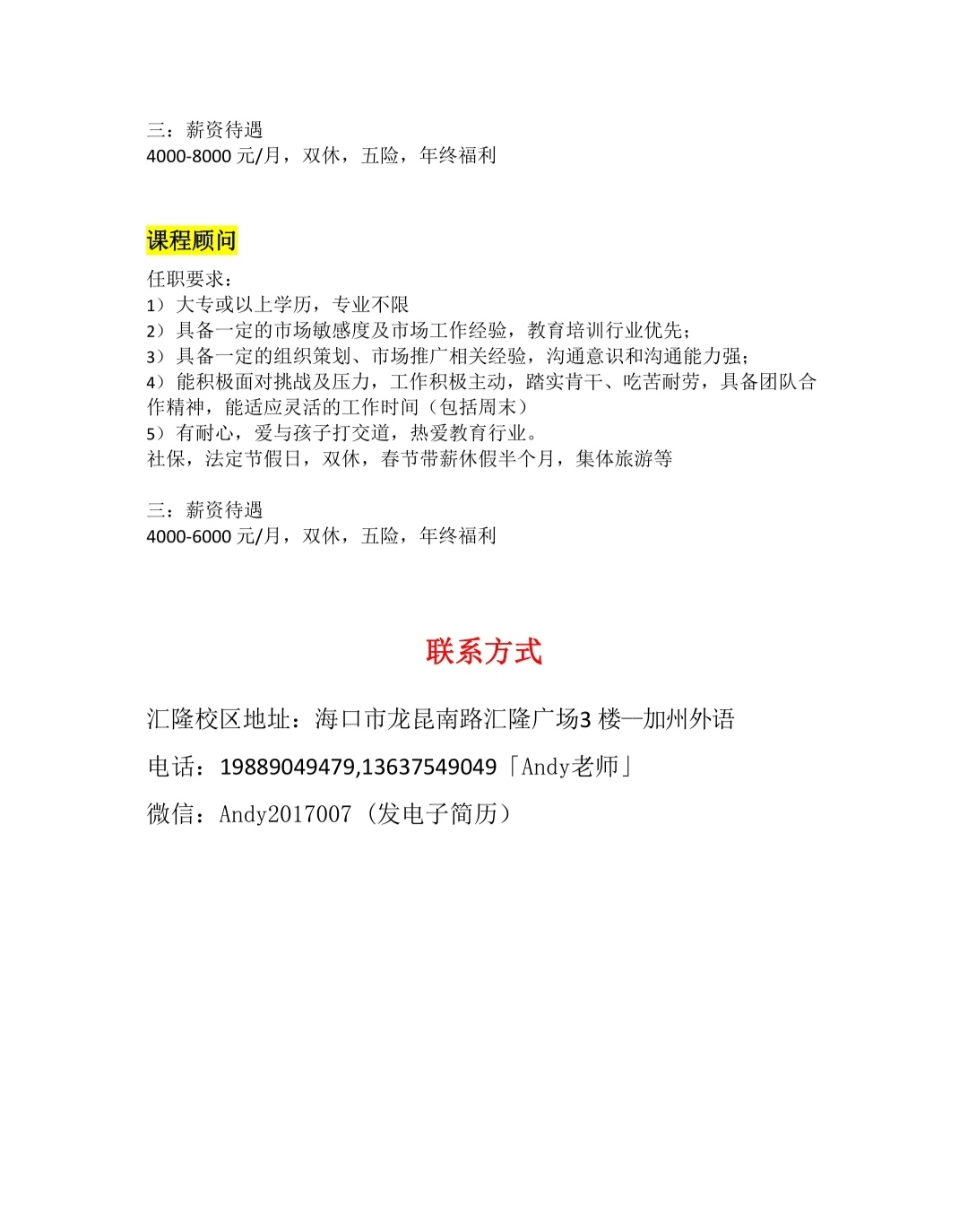 招聘信息 当前位置: 首页 >> 招聘宣讲 >> 招聘信息 >> 正文 招聘信息 | 加州国际外语学校招聘 发布日期:2020-08-10 点击: (温馨提示:新型冠状病毒肺炎疫情期间,请往邮箱投递简历。在未被进一步通知的情况下不要擅自前往应聘单位。招聘公司地址仅以本网站为准,请同学们面试时注意核对。) 上一篇:2020年普通高等学校毕业生应征入伍公告 下一篇:招聘信息 | 海南志晨职业培训学校有限公司