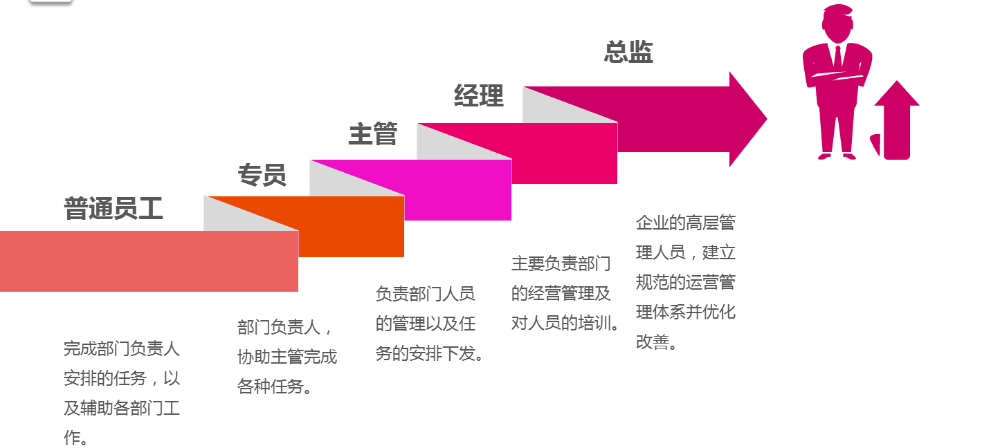 3、职业发展规划:普通文员→专员→主管→经理→总监(完善的晋升体系,内训外训相结合)