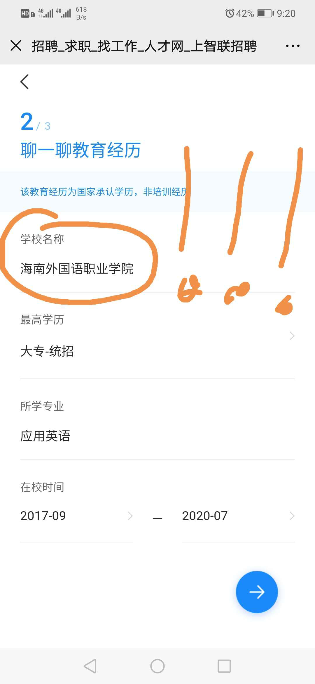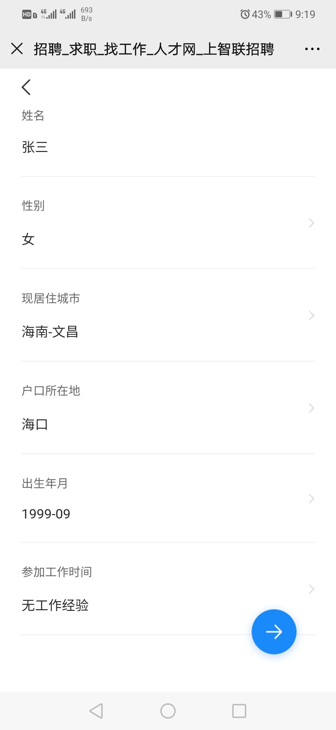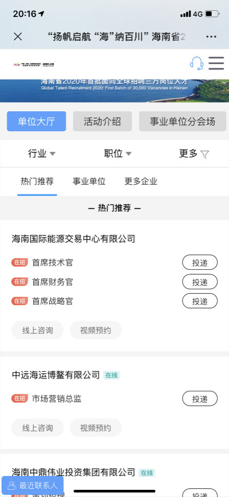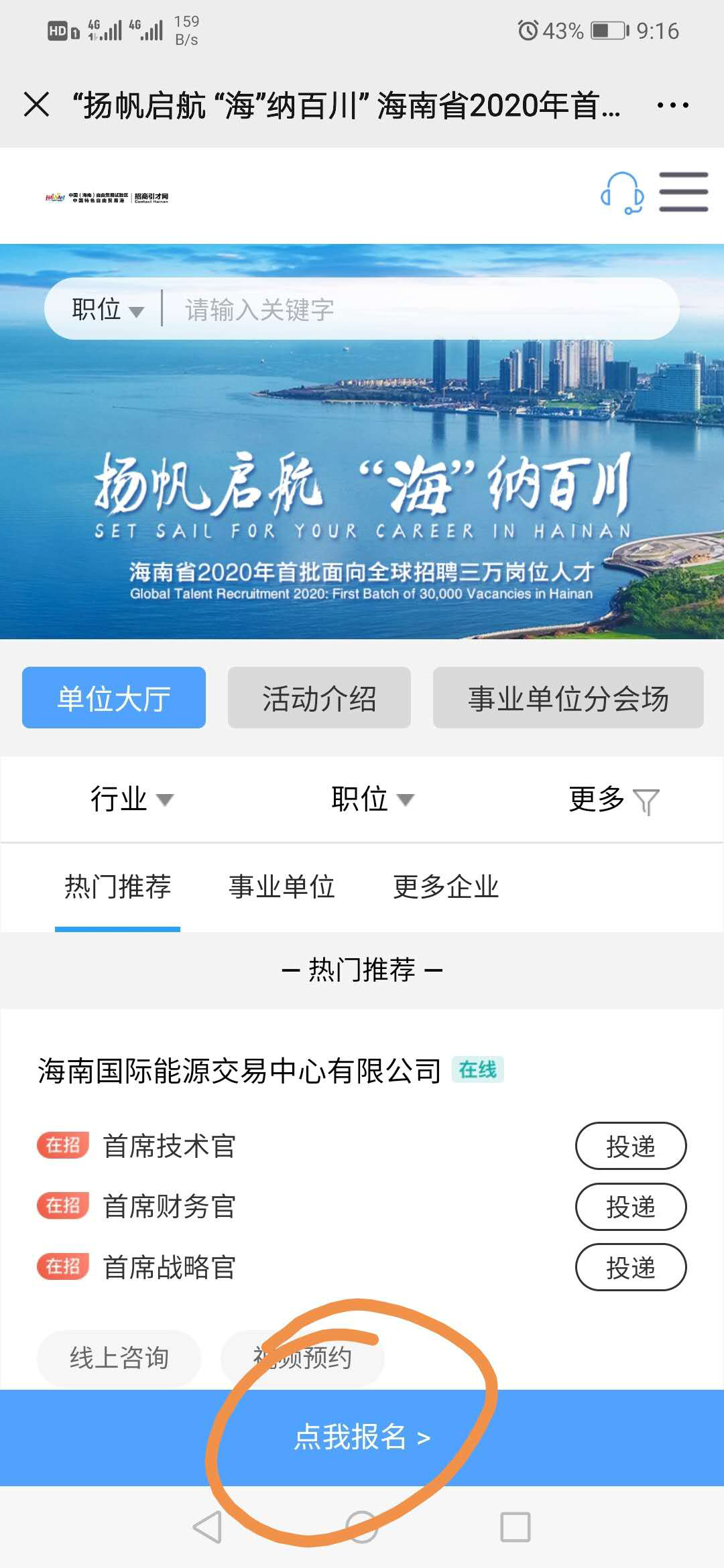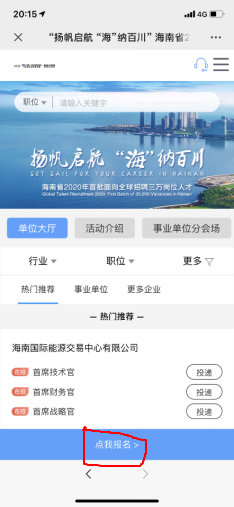通知公告 当前位置: 首页 >> 通知公告 >> 正文 手机操作手册及常见问题处理指南 发布日期:2020-05-27 点击: 登录操作方式【手机端】 1、微信扫码进入,进入活动页面; 2、点击【报名参会】-【点击报名参会】; 3、进入求职者大厅,点击下方【点我报名】; 4、选择【求职者登录】,使用手机(账号) 注册登录;进入简历投递界面; 5、创建简历 6、填写教育经历(必填非常重要)!!! 7、填写就业意见(必填) 8、简历创建成功 9、投递简历 上一篇:beat365英国官方网站2020届毕业生第二场网络视频双选会 下一篇:beat365英国官方网站2020届毕业生网络视频双选会参会指南