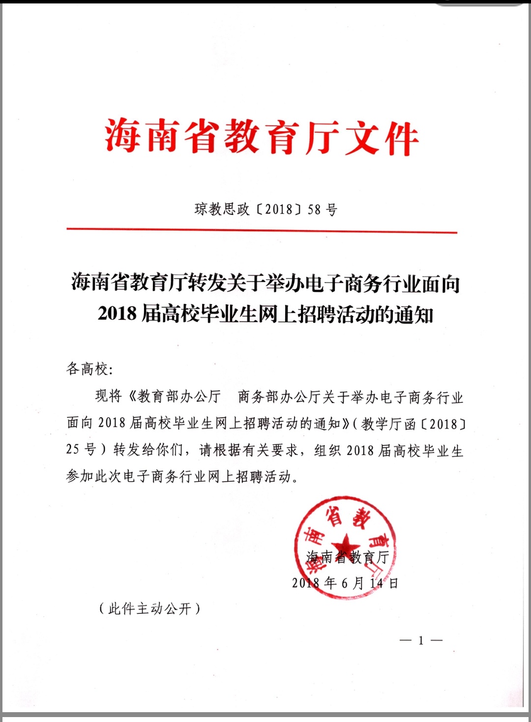 通知公告 当前位置: 首页 >> 通知公告 >> 正文 海南省教育厅转发关于举办电子商务行业面向2018届高校毕业生网上招聘活动的通知 发布日期:2018-06-21 点击: 上一篇:beat365英国官方网站 英语系2018届毕业生、 国际商务系2019届电子商务专业实习生 专场招聘会招聘单位名单汇总 下一篇:青年国际实习交流计划资助流程方案