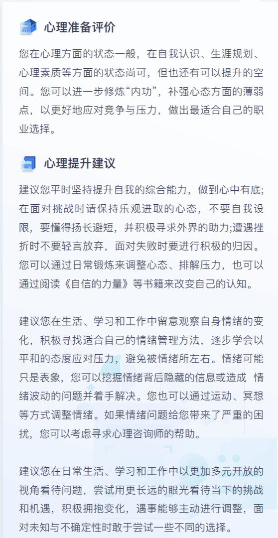 就业准备测评是一项专业的评估工具,旨在帮助你了解自己的职业兴趣、优势和适合的职业方向。通过一系列的评估和测试,你将获得一份详细的职业报告,为你的就业之路指明方向。涵盖了多个方面,包括职业兴趣、个人能力、价值观等。通过专业的评估,你将深入了解自己的职业性格和倾向,为选择适合的职业提供科学依据。并且就业准备测评不仅提供了评估报告,还为你提供了个性化的建议和指导。无论你是正在寻找实习机会还是准备毕业后就业,这份测评都将是你不可或缺的指南。