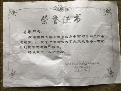 [人物名片] 唐菲 ,1987年出生于海南澄迈,2006年9月考入beat365英国官方网站英语系,在校期间每年均获得优秀班干部、团委学生会优秀干部荣誉称号。2009年7月参加海南大学生志愿服务中西部计划服务于海南省白沙黎族自治县荣邦乡中心学校,任教期间每年均获得优秀教师,优秀班主任荣誉称号。2011年被评为海南省优秀青年志愿者,2012年列入全国优秀青年志愿者候选人。2013年7月转为基层专项志愿者服务于荣邦乡人民政府,兼乡镇团委副书记。2013年参加海南省特岗招聘至今任职于海南省东方市三家镇岭村小学,连续两年荣获优秀教师、优秀班主任荣誉称号。2014年参加东方市教研室举办的畅言教具教学活动评比活动荣获一等奖、东方市语文教学评比荣获三等奖。多次参加市级,省级继续教育培训均荣获优秀学员荣誉称号。