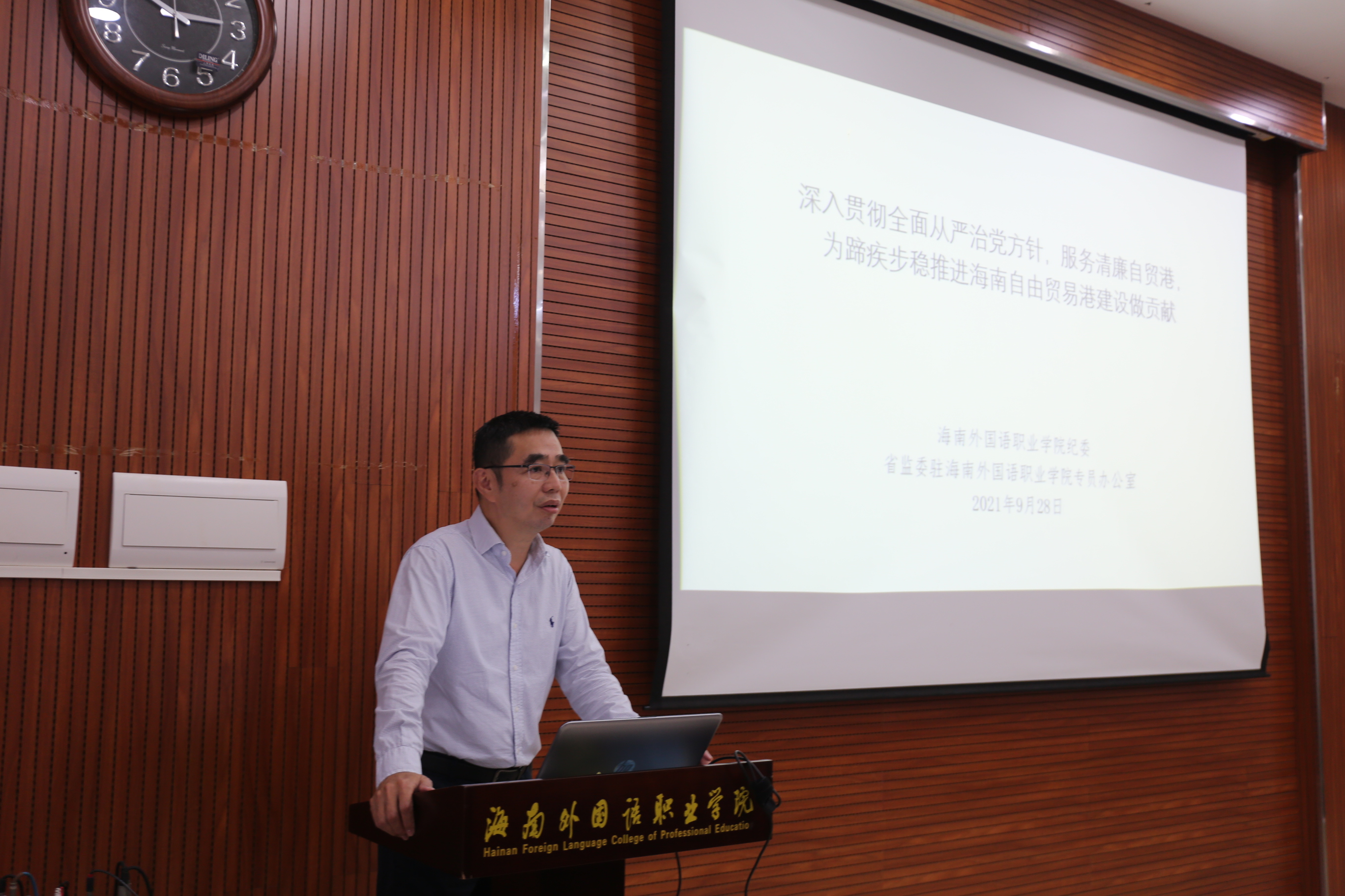 会上,学院纪委书记、监察专员、协调小组组长黄培怡以《深入贯彻全面从严治党方针,服务清廉自贸港,为蹄疾步稳推进海南自由贸易港建设做贡献》作专题党课辅导报告。黄培怡结合自身学习和调研成果,阐述了深入理解全面从严治党的“全面”内涵、深入认识和推进全面从严治党、深刻认识新时代全面从严治党的重要方略、积极推动我院全面从严治党向纵深发展等四个方面的问题。