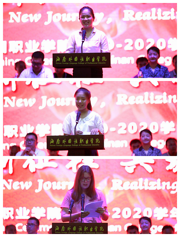 教师代表杨丹老师对新生们提出希望,希望同学们珍惜时光,努力提升自己的各项能力,争做德智体美劳全面发展的优秀大学生;珍惜友谊,在大学期间交到许多真心的朋友,拥有一个美好的大学生活;珍惜健康,养成良好的生活习惯。新生代表刘畅同学向老师们表示感谢并承诺:要树立青年大学生意识和学院主人翁意识,不断增强社会责任感,将爱国之情融入到祖国的发展之中。来自俄罗斯的留学生代表方雨晴对教师表达感谢,希望在学院学习期间可以为中国和俄罗斯的经济、政治、文化交流做贡献,用她与海外院的“小火”来点燃中俄友谊的“大火”。