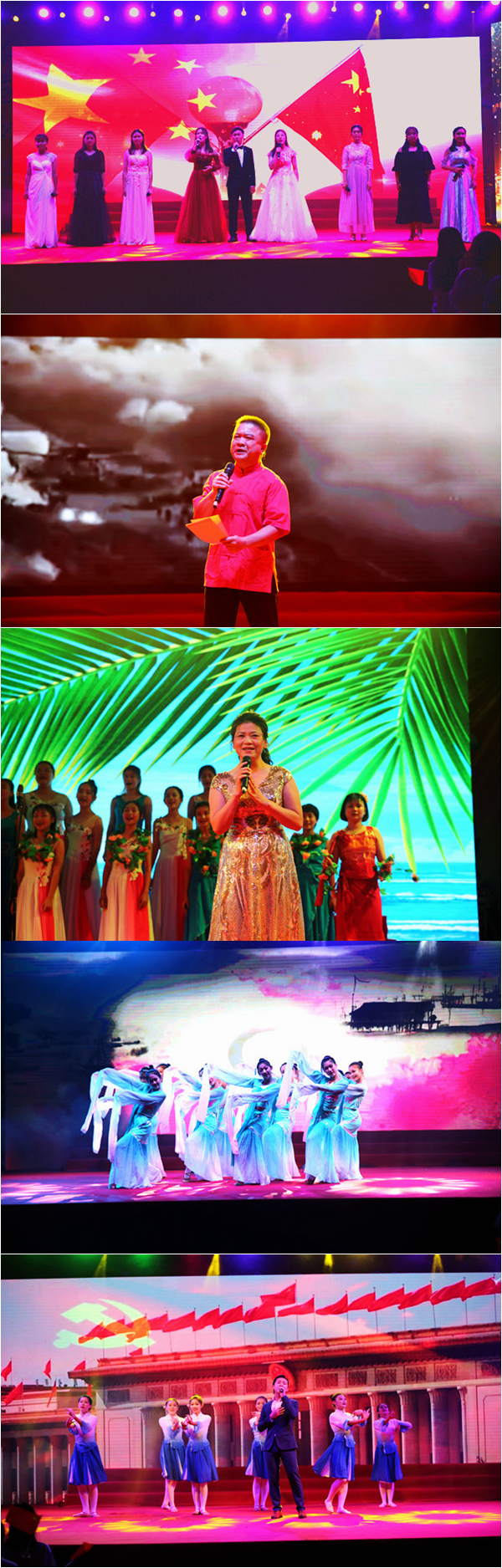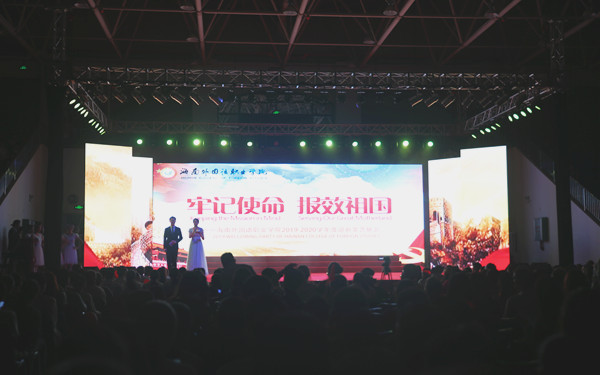 晚会由我院教师黎娅玲和柬埔寨外教王虎老师带来激情洋溢的开场《Go文昌》开幕,从一开始就带动了全场的气氛。一首由合唱团同学们带来的《请到天涯海角来》伴着熟悉的旋律,朗朗上口的歌词,表达学院对新生到来的欢迎。一曲《我爱你中国》唱出了同学们对祖国的爱,唱出了不忘初心、报效祖国的决心。舞蹈队同学们带来的经典舞曲《采薇》、《塔兰泰拉》以曼妙的舞姿引得台下观众掌声不断,让师生们现场感受了多样的舞蹈风情。由我院音乐老师原创歌曲《记忆夏天》以二重唱的形式将晚会推向高潮,同学们与台上精彩的演唱互动,自发打开手机闪光灯,投射灯和闪光灯互放光芒,陶醉其中,感受着夏季青春的热情。英语系林鹏书记的配乐诗朗诵《青春中国》,激情澎湃道出对祖国深深的热爱,激励着同学们新时代争做新青年。歌舞表演《不忘初心》讴歌了中国共产党人不忘初心、牢记使命、砥砺前行的壮志豪情。至此,迎新晚会落下帷幕。