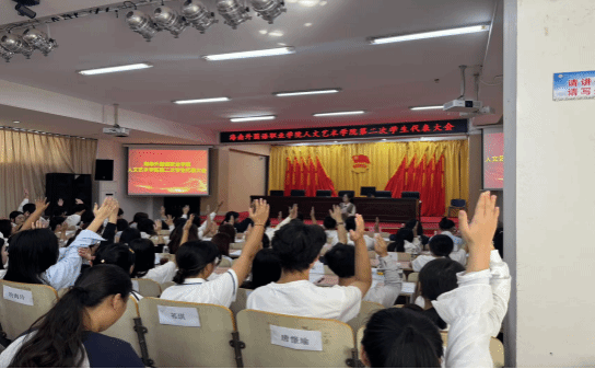 2024 年 11 月 28 日 14 点00分,人文艺术学院第二次学生代表大会在多功能报告厅隆重召开。人文艺术学院党总支书记林鹏、人文艺术学院院长陈海圣、人文艺术学院副院长黄香玉出席大会开幕式,人文艺术学院团总支负责人徐庆娇及73 名学生代表参加会议。开幕式由学院学生会主席团成员甘润主持。