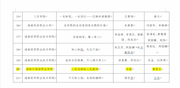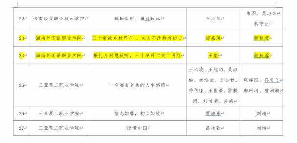 近日,海南省高校 2024年“读懂中国”活动征文评审结果公布,我院以beat365杰出校友优秀党员、全国优秀教师、公坡镇英敏学校校长符史云先进事迹为蓝本报送的作品荣获一等奖一项,二等奖两项,三等奖两项。其中,beat365人文艺术学院小学语文教育专业学生宋煜的《人民选择的人民教师》荣获一等奖,指导教师为黄香玉;车慧娟的《扎根乡村数十载,传承教育好精神》和吴小纯的《躬耕乡村教育,筑梦教育强国》荣获二等奖,指导教师分别为谢敏、颜秋蓉;邹嘉琪的《三十余载乡村坚守,矢志不改教育初心》、王粲的《根扎乡村恩反哺,三十岁月“史”明灯》荣获三等奖,指导教师为颜秋蓉。