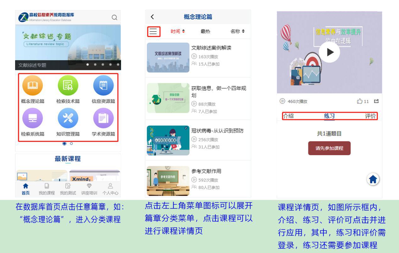信息时代,需要信息素养。具有良好的信息素养,可以把事情做得更快、更好、更有效率,可以为自主学习、终身学习打下良好基础。高校信息素养教育数据库,课程涵盖了概念理论篇、检索技术篇、信息资源篇、检索系统篇、知识管理篇、学术资源篇、学术写作篇、科研工具篇、应用场景篇九大模块的数百节培训课程,以微视频的方式,通过2-5分钟讲述一个知识点,视频简短,但是干货满满,便于利用碎片化时间进行学习,可以视为高校《文献检索》或《信息检索》课程的升级版,跳出传统文检课的框架,重新定义信息素养教育的核心和逻辑;本数据库采用全案例教学,注重探究,将知识点嵌入到具体的案例中,在案例设计的过程中强化探究性,同时每个课程后面有相关的课后练习题,从而实现边学边练习。
