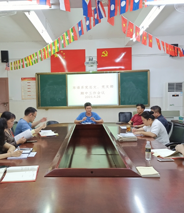 2021年4月26日下午4点20分,东语系党总支在系会议室召开了期中工作会议与党史学习教育推进工作会议,党总支书记王诒奎同志主持会议,总支委员,四个支部的书记与委员参会。会议听取了四个支部的期中工作汇报总结,就下半学期重点党务工作进行了讨论研究,并就党史学习教育推进工作做了统一规划部署。