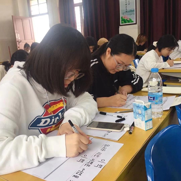 习字的同时,同学们互相鉴赏,优秀书法作品的展示也激励着同学们决心学好外语,掌握书写规则,为专业学习打好基础。