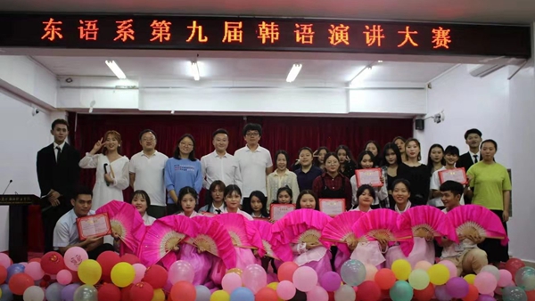 在经过激烈的角逐后,16应韩(501)林明曼同学获得一等奖,18应韩吴茜奕同学、16应韩(502)龚燕同学获得二等奖,18应韩金丽琴同学、16应韩(502)梁兰同学、16应韩(501)张芳馨同学获得三等奖,18应韩梁少芳、梁其友、李素香同学获得优秀奖。由韩语教研室主任金焱等老师分别为获奖同学进行颁奖。最后,所有表演人员及参赛选手和老师们温暖合影,此次比赛活动圆满结束。