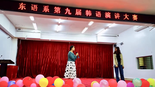比赛前的开场舞是由19应韩的同学们为大家表演的《扇子舞》。在六位同学优雅的舞姿下,第九届韩语演讲比赛拉开了帷幕。由16应韩(501)班,16应韩(502)班及18应韩班的同学组成的九位参赛选手开始了紧张激烈的比赛。第一轮环节为主题演讲。演讲主题多彩多样,各色各异。既有贴近生活的兼职经历、火锅体验,也有诗意的远方之论、梦想之谈。九位同学在充分准备的情况下各有千秋,表现的旗鼓相当,为大家带来了十分精彩的演讲。第二环节即兴演讲则十分考验同学们的反应能力,即使是即兴发挥,同学们也凭借着扎实的韩语功底,顺利完成考验。