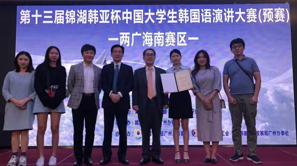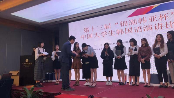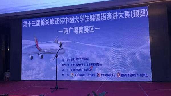 11月17日,韩亚航空驻广州办事处在广州建国酒店举办了第十三届锦湖韩亚杯中国大学生韩国语演讲大赛-两广海南赛区分赛。经选拔决定,由东语系韩语专业15应韩(501)王林玉同学代表我院参赛。同时预备种子选手王添(15应韩501)、赵湜佳(17应韩)去现场观摩,由李耕百老师带队、指导外教苏一权老师及金翰娜老师随行。