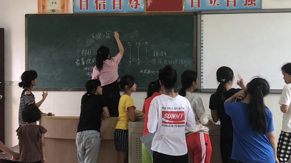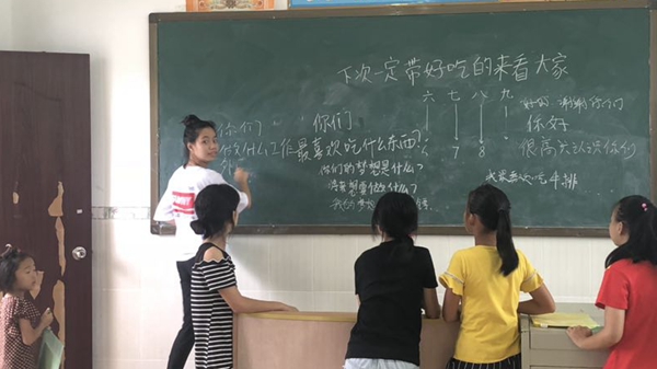 然后在孩子们的带领下,党员同志们深入课堂,利用黑板、粉笔,通过书面与孩子们进行更加深入地交流。