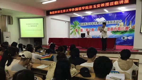 11月15日上午10点至11点半,在多功能报告厅,东语系邀请北京大学外国语学院博士生导师、北京大学东方学研究院副院长张玉安教授举行了题为“影响跨文化交流的几个重要因素”的讲座。本次会议由东语系系主任郭艳萍教授主持。