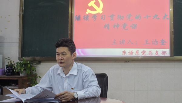 为继续深入学习贯彻党的十九大精神,东语系党总支组织师生党员开展了内容丰富、形式多样的系列学习活动。1月4日下午,东语系党总支在系会议室召开了全系党员大会,继续深入学习贯彻十九大精神,进一步掀起了学习贯彻十九大热潮。会议由东语系党总支书记王诒奎主持。