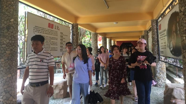 麦总经理为学生以及同期到访的海南省旅游景区协会秘书长苏群(右二)进行讲解