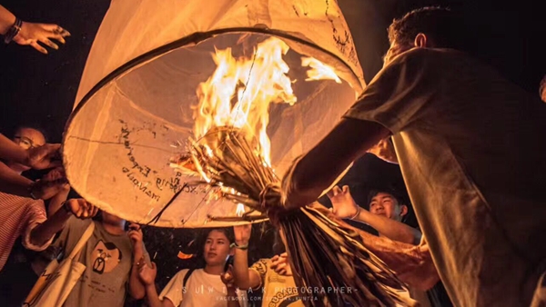 晚饭过后,我们就去燃放泰国学生们做的大型孔明灯。乡下的夜空,因为灯火微弱,星星才得以现形。在这般夜色下,这般融洽的气氛,离别悄然而至。