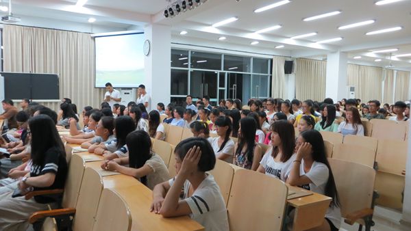 9月22日,东语系 2014级新生见面会图书馆多功能报告厅召开。东语系主任王诒奎、党总支书记张伟、专业带头人耿铁珍教授、外教及各教研室负责人、学生代表以及2014级新生和辅导员参加会议。团总支书记吴深主持会议。